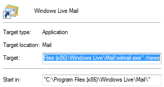 Windows Live Mail Shortcut Command Line Option for News Mode