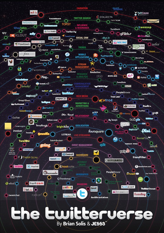 A new year, a new Twitterverse. 2011 marks the debut of the Twitterverse 1.0. Again, I revisited the landscape of useful Twitter apps designed for marketing, business, and service professionals. This time, we organized and positioned “representative” apps across 19 rings in the Twitter egosystem over the previous 12. Like its sibling, The Twitterverse is designed as a transmedia object.