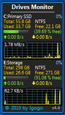 Drives Monitor – keeps an eye on your hard drives tracking the percentage used for storage, how much is available and the transfer speeds.
