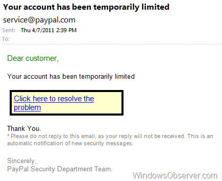 Just this morning I received no less than six emails, all supposedly from PayPal, notifying me that there was a problem with my account and it was temporarily limited. It also asked me to log in and fix the issue. Of course, it provided a convenient link to make it easy to reach the website.