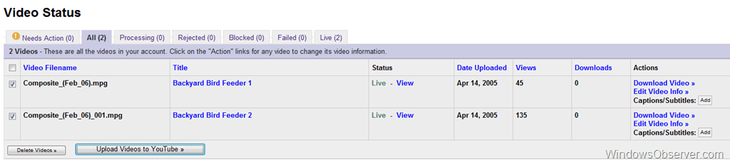 I had two videos from 2005 that I had shot of our backyard bird feeders and I just went through the upload process to YouTube and it was quick and easy.