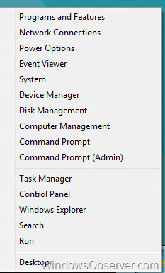 The first one I mentioned in a post from last week My First 24 Hours With The Windows 8 Consumer Preview. You get this context menu by dragging your mouse down into the lower left corner and right clicking. You can do this in either the Desktop or on the Metro Start Screen. As you can see it gives you access to a good collection of items to manage your system.