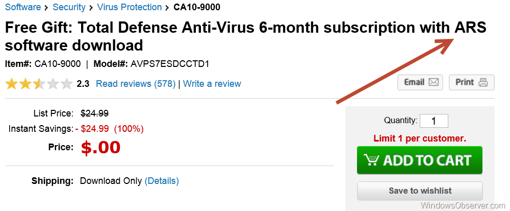 When you shop at CompUSA, who is owned by TigerDirect.com, there is always a free gift in your shopping cart at checkout. This six month subscription version of Total Defense Anti-Virus software is marked to cost you nothing as a free gift should.