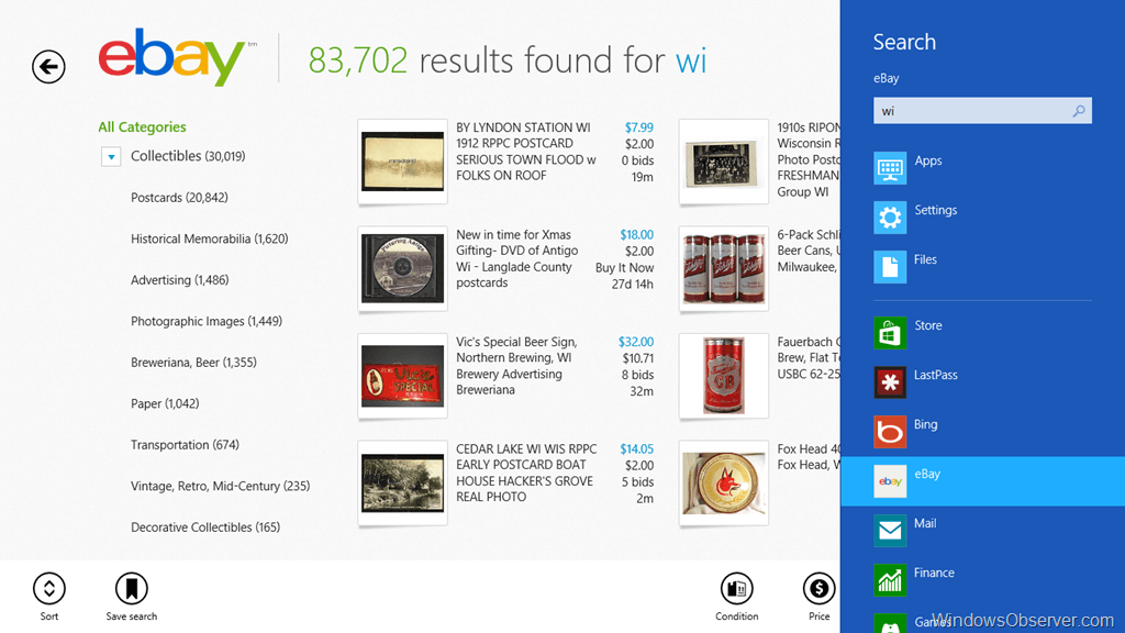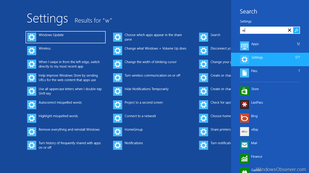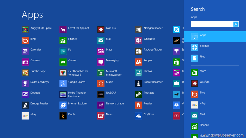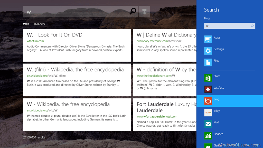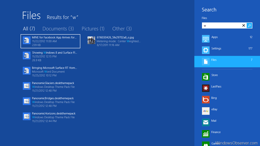 By selecting that Search Charm you get the full search interface on Windows 8:
