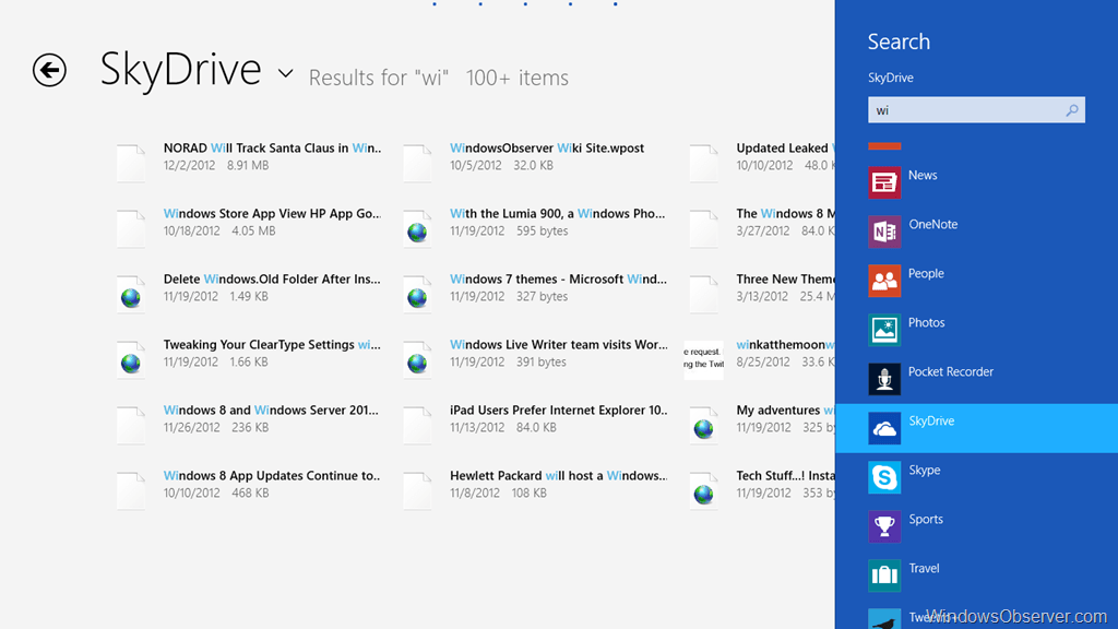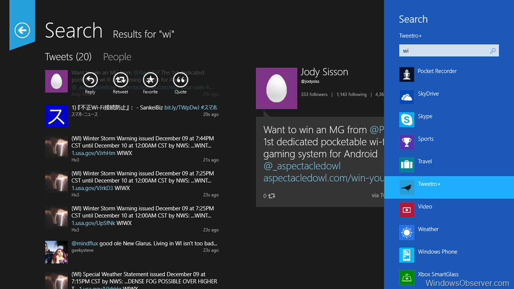 Once you get used to that Search Charm and the fact that it is available to you in any app and at anytime then you will begin using it on a regular basis to find the info you want. It will not matter if it is on your local system, in the cloud, on the web or on Twitter you will soon discover it is a very powerful way to find what your are looking for.
