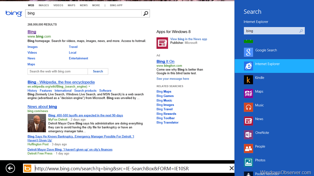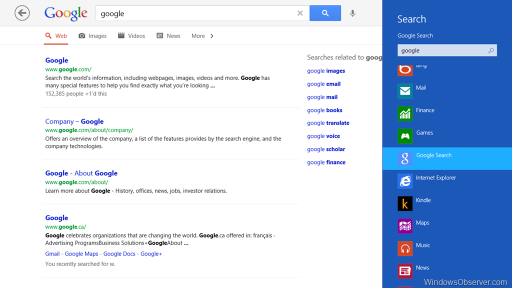 Now lets talk about searching the Internet where this entire discussion began. By selecting my default browser in Windows 8, which happens to be IE10, I can search my default search engine directly via the browser right alongside of all the areas I can search.