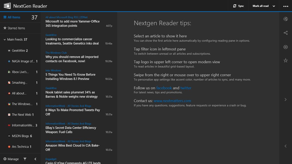 I have been a big fan of Nextgen Reader with the full Google Reader support they brought to both the Windows Phone and Windows 8 platforms.  I used Google Reader as the primary means to share tech links throughout the day on Twitter and so it was great to have one app, that operated and and felt the same on both systems, to review all of the RSS feeds I kept up with.