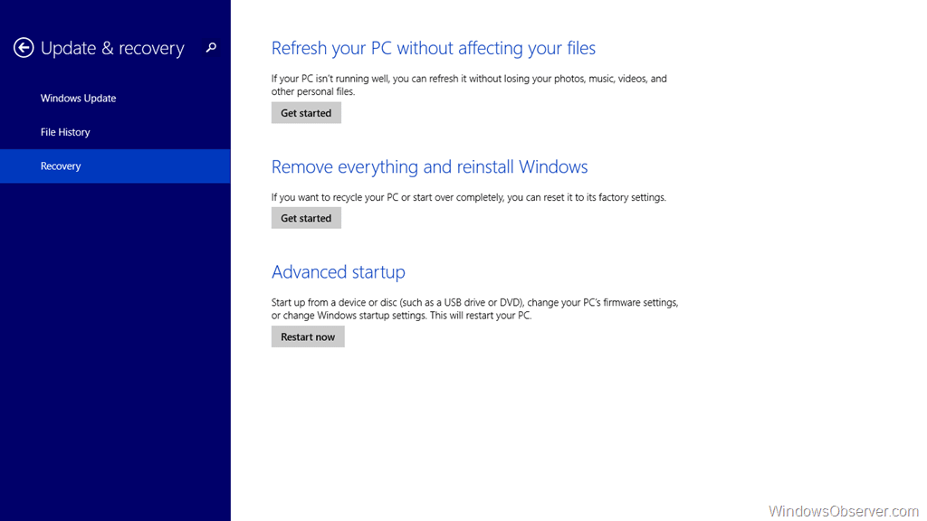 Here you will find three entries and the one you want is the last one – Recovery – Refresh your PC without affecting your files is the top choice on this page.