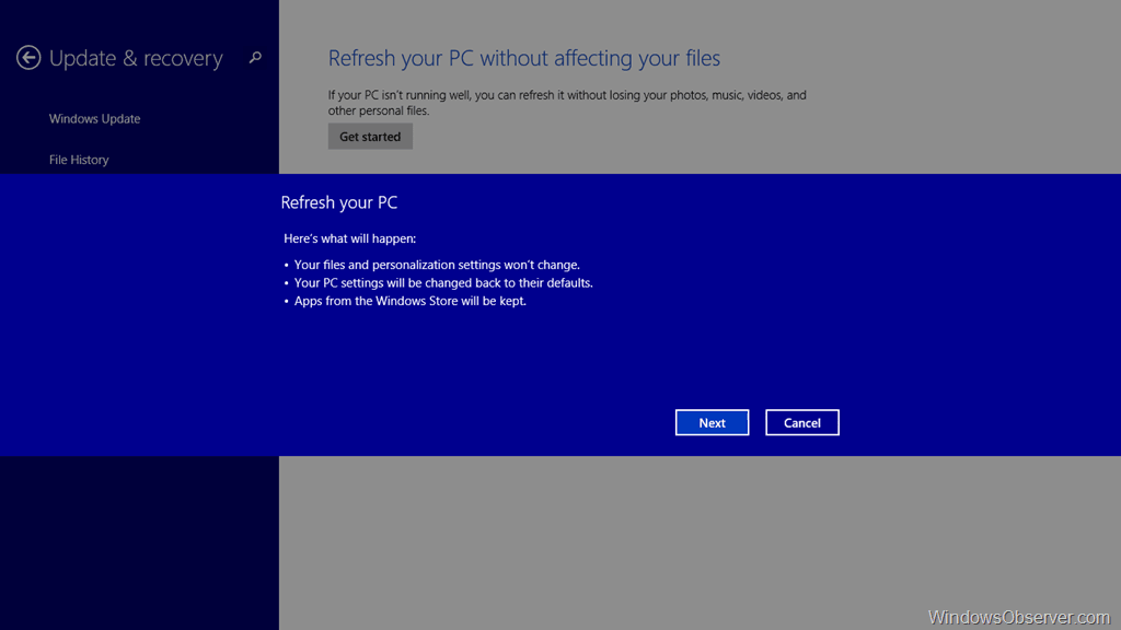Once you tap or click Get started you will see what happens during the refresh process. Just tap or click Next to get things going.