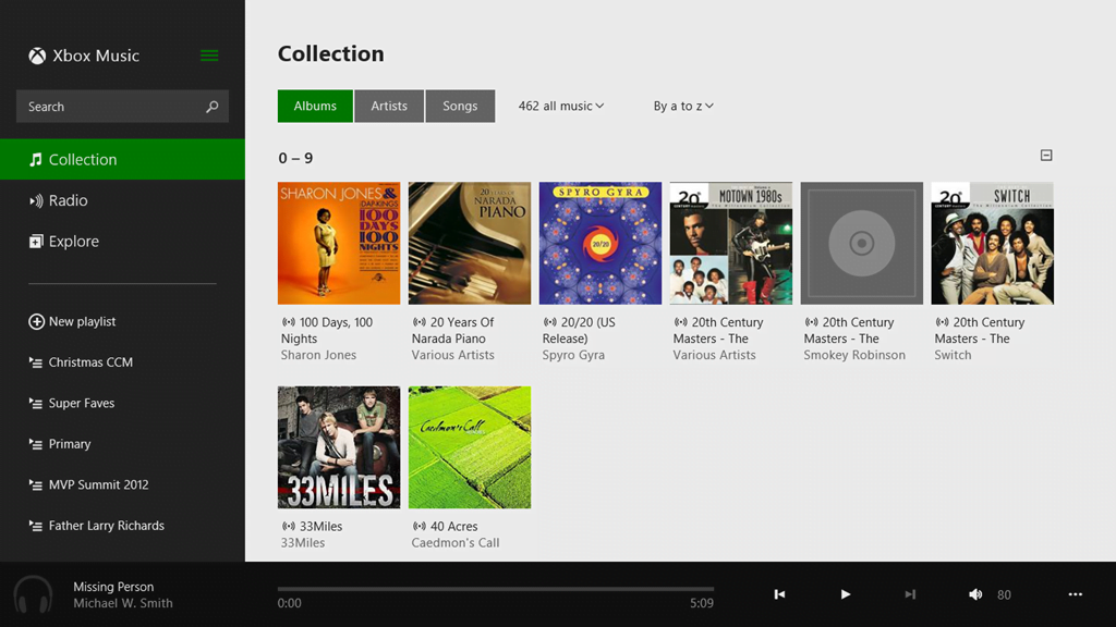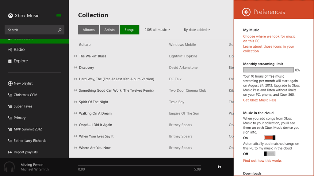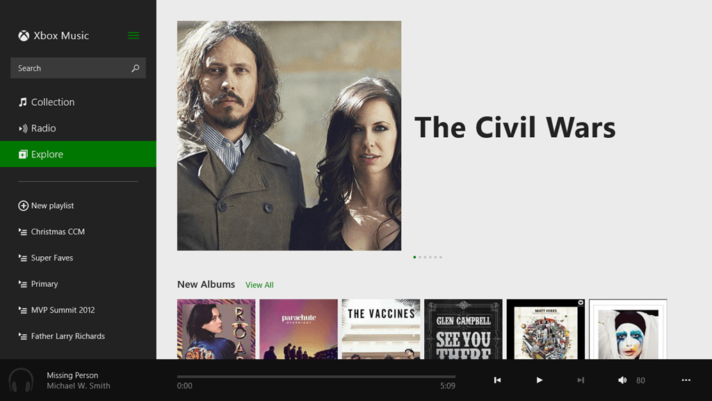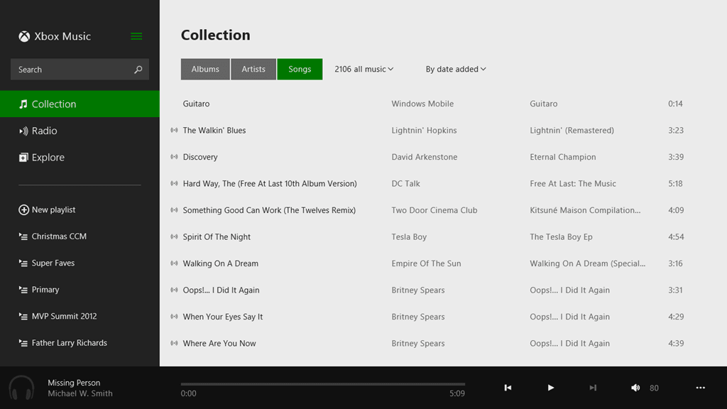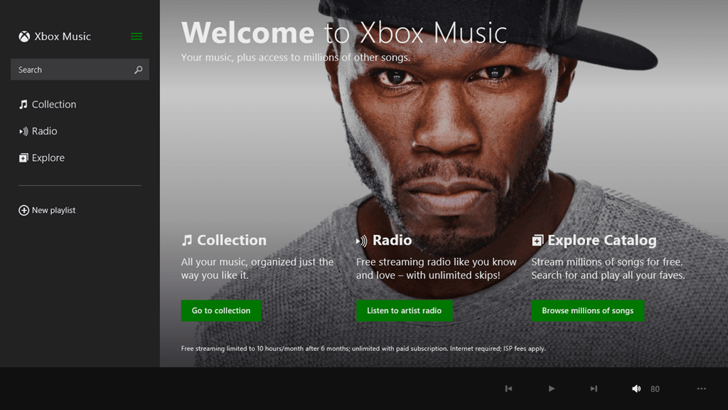 The new welcome screen cycles through various artists images on the main screen. Check out the new sidebar which you can minimize by clicking the three green bars next to the Xbox Music title. This new sidebar has immediate access to your playlists as well as the major areas of Xbox Music Collection, Radio and Explore.