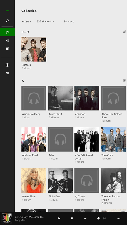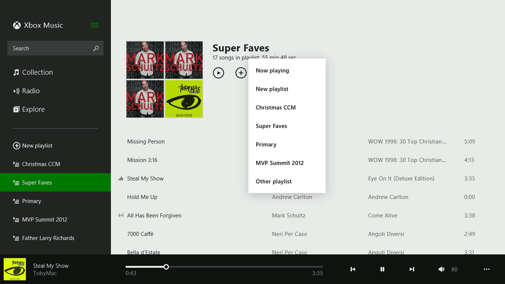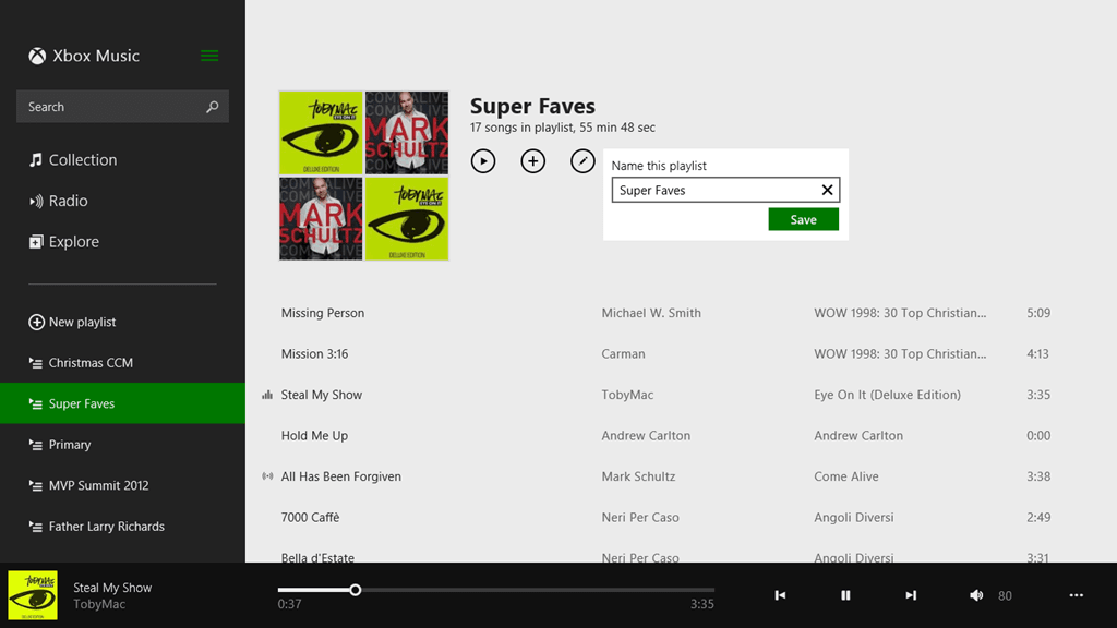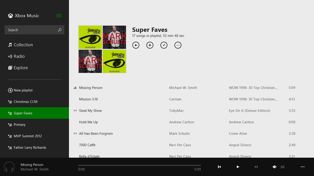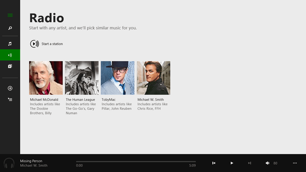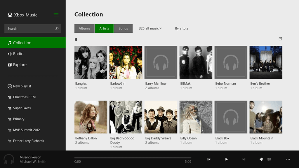 The new welcome screen cycles through various artists images on the main screen. Check out the new sidebar which you can minimize by clicking the three green bars next to the Xbox Music title. This new sidebar has immediate access to your playlists as well as the major areas of Xbox Music Collection, Radio and Explore.