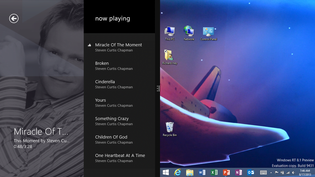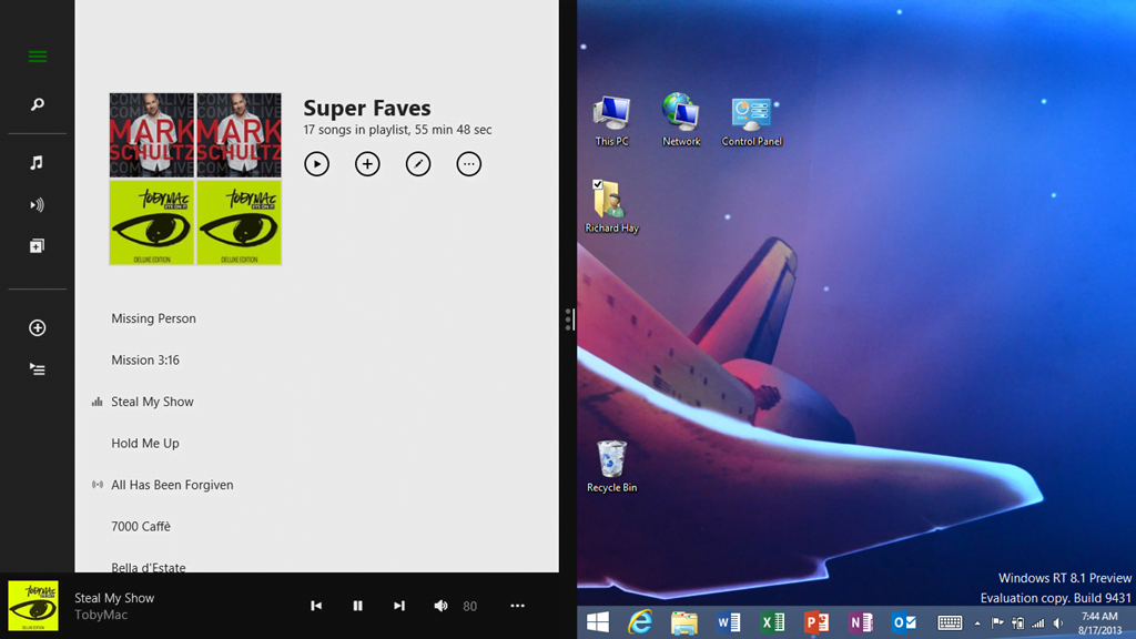 Here are new 50/50 snapped views of the Now Playing and playlist screens. Notice the sidebar automatically minimized itself to save screen space when the app was snapped.