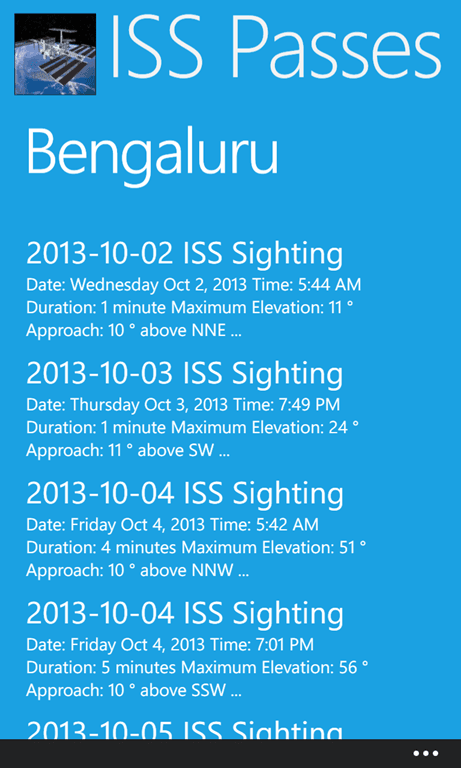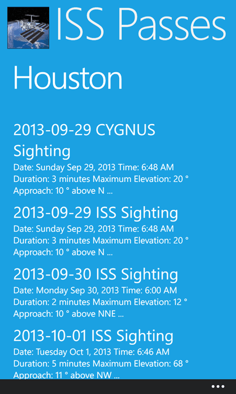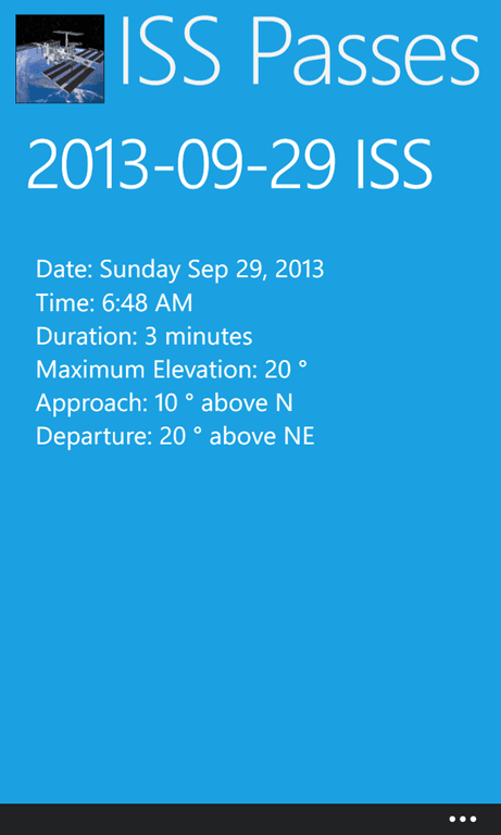 The data provided by NASA shows the basic info of when the pass will occur, what direction it is coming from, the direction it is heading and the elevation with 90 degrees being directly overhead. If you are in or near one of these 20 cities then this app will still give you a good idea of where to look for the ISS.