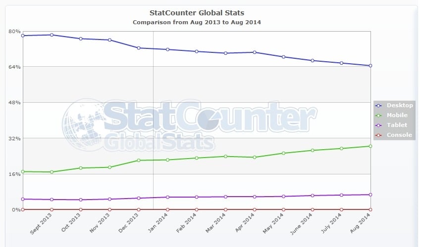 According to StatCounter mobile Internet use increased 67% from August 2013 (17.1%) to August 2014 (28.5%). They also noted that tablet use during the same period increased from 4.8% to 6.8% while desktop usage, still the most popular option, decreased from 77.98% to 64.58%.