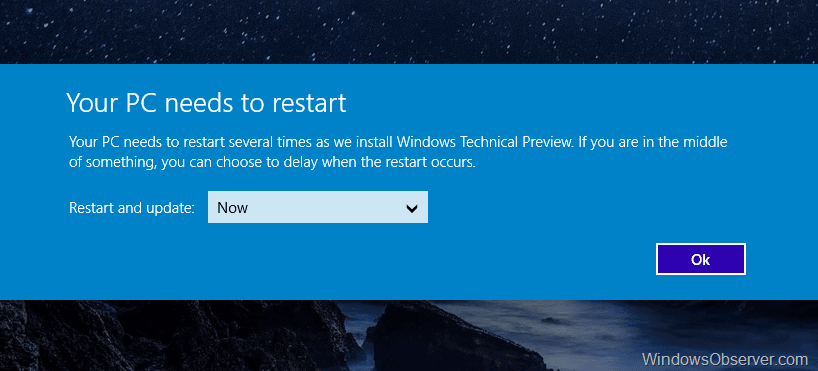 The update process using the PC Settings>Update and recovery>Preview builds was very smooth and took less than 45 minutes from start to finish plus all of my previous settings, apps, etc. were intact when the system booted back to the Windows 10 Technical preview desktop.