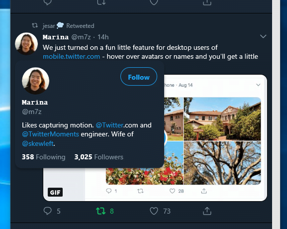 The first one is user profile cards. When you hover your mouse over a user’s avatar or their @name in a tweet, a small info card will appear and you can interact with it.