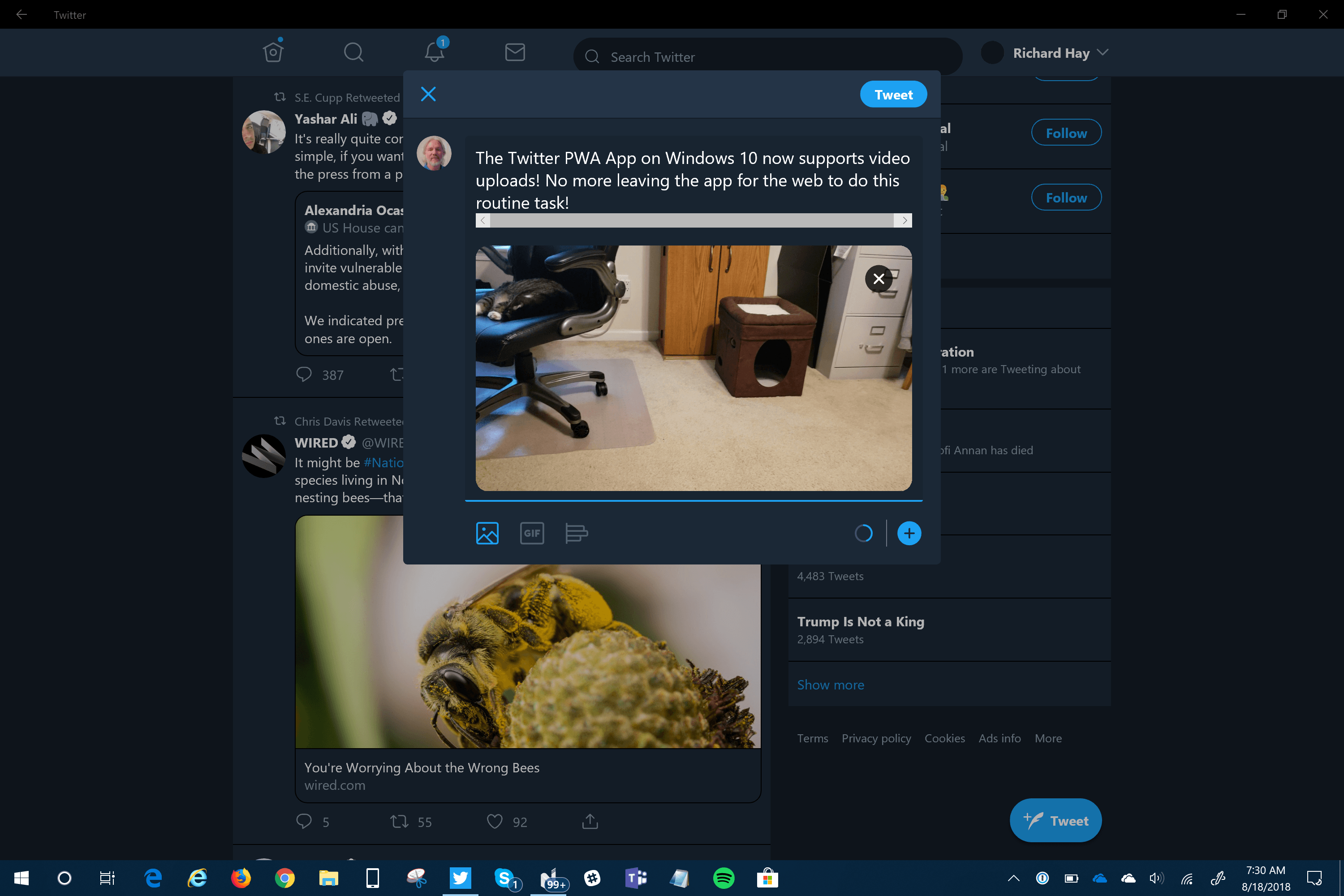 Previously you could only add images as you composed tweets but now it is just as easy to add a video to a tweet. Currently you can not edit the video in any way inside the Windows 10 Twitter PWA app so be sure you take care of that outside the app first before using the video in a tweet.