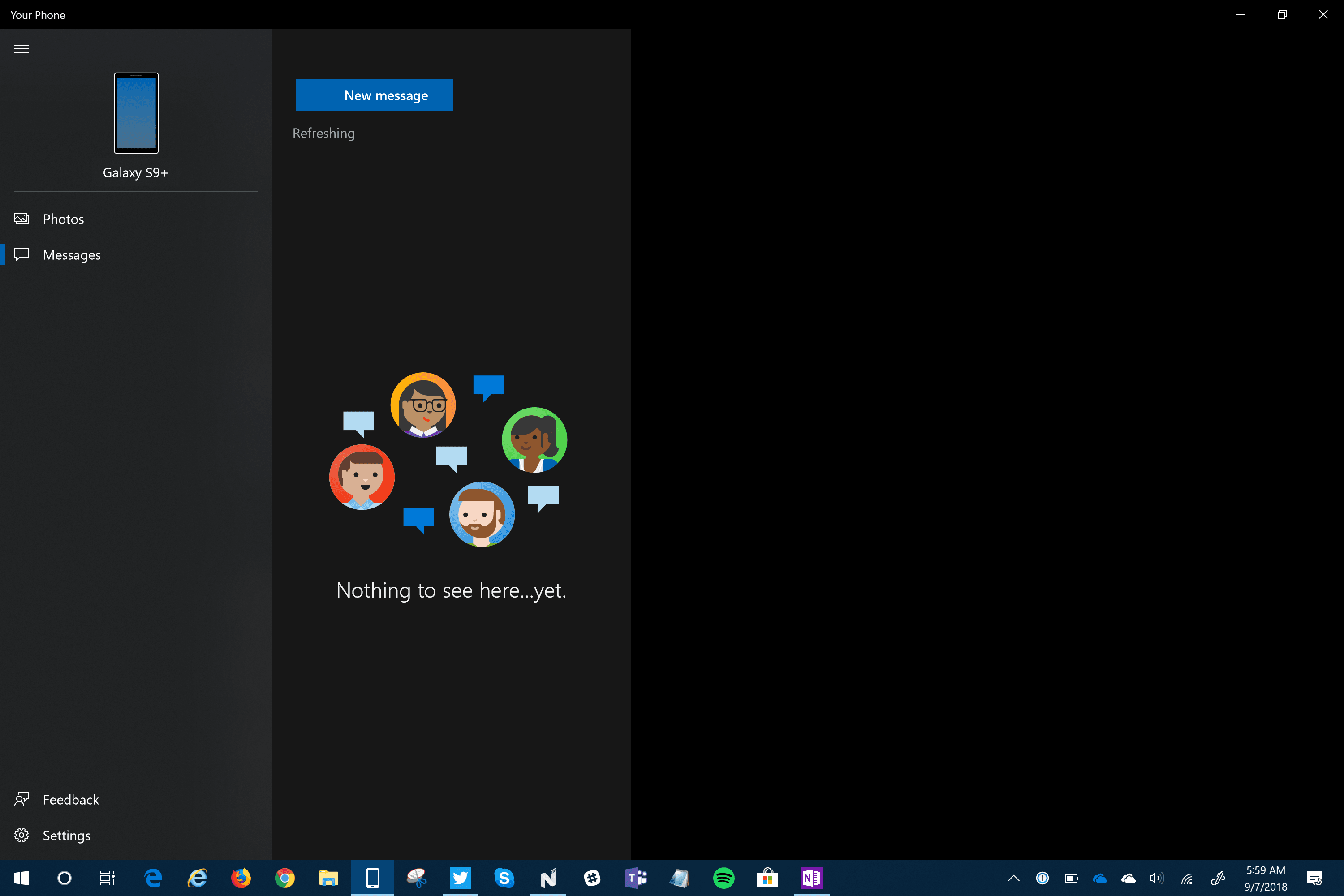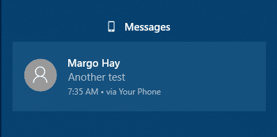 • Message notifications work in the Action Center on Windows 10 but they are not interactive and the Your Phone app has to be running for them to push a notification.